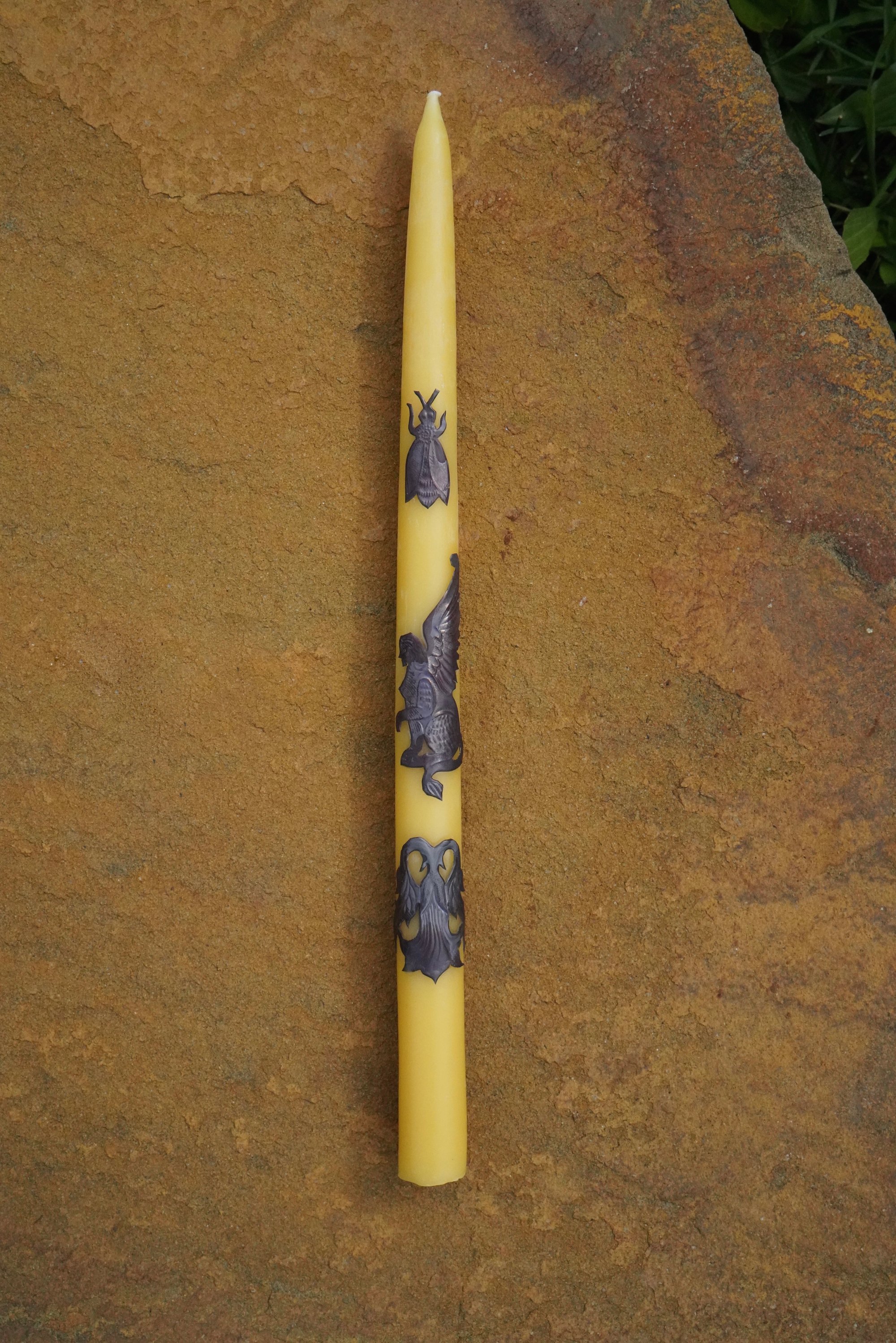 These 100% beeswax tapers smell heavenly, burn bright and long, and are adorned with imagery of a bee, sphinx, and datura bloom made of hand cut and embossed copper. The wax will burn away from the copper, leaving behind the lasting metal charms.