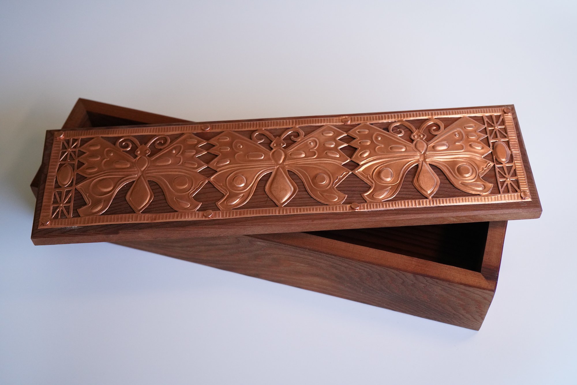 One of a kind hand-built box adorned with embossed copper butterflies and stars.