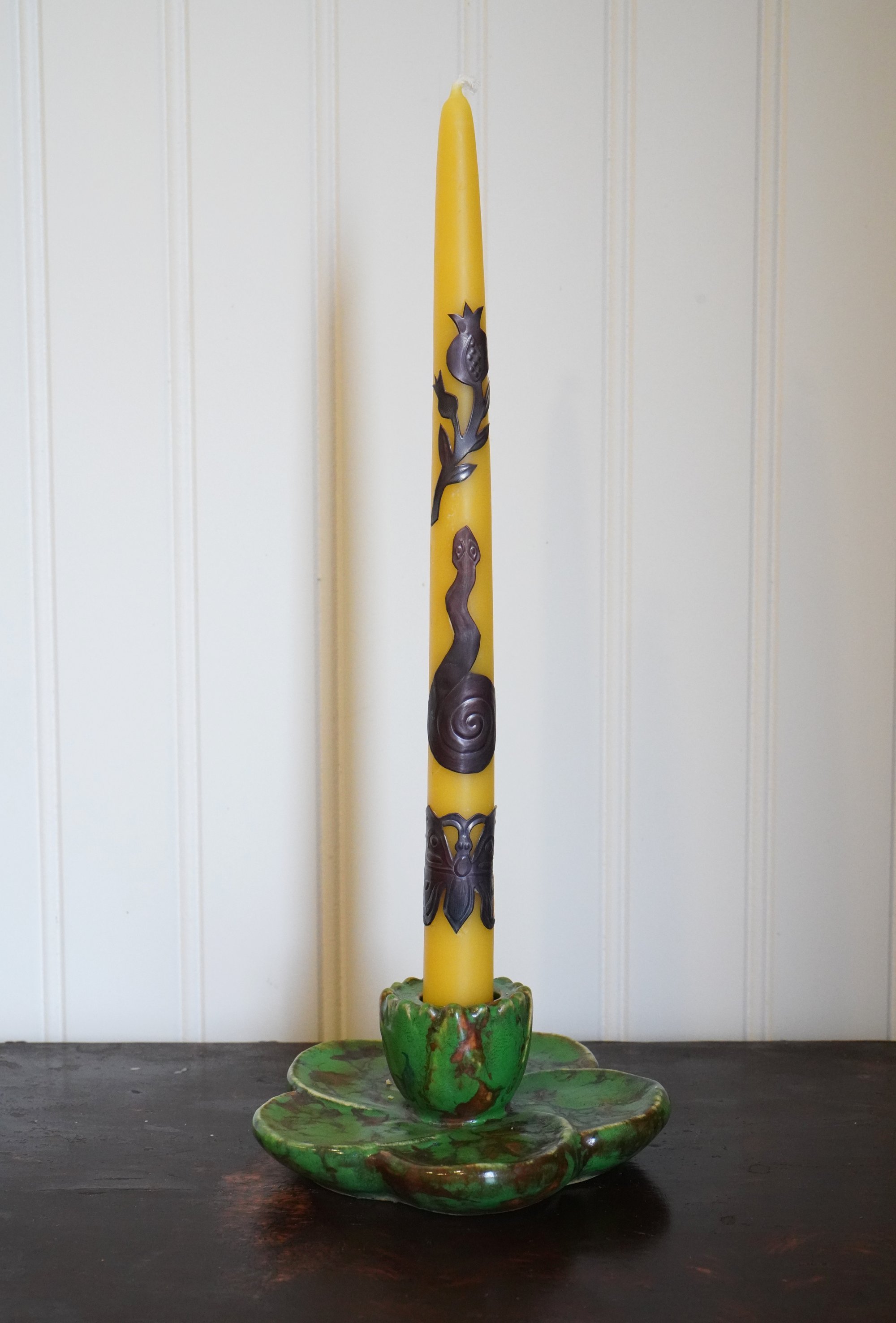 These 100% beeswax tapers smell heavenly, burn bright and long, and are adorned with imagery of a pomegranate bough, snake, and butterfly made of hand cut and embossed copper. The wax will burn away from the copper, leaving behind the lasting metal charms.